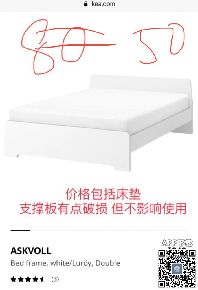 Double size 床 50刀 有床垫 床底的一个木板破了 不过不影响使用 1月13号available 有需要的可以短信联系0428866648