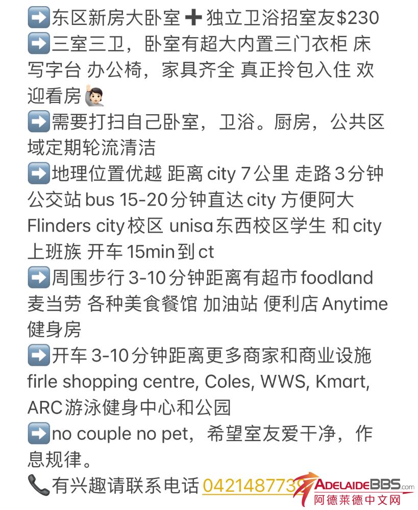 阿德莱德东区Hectorville独立卫浴出租 租期最好从一月中开始 希望租客爱干净,安静,作息规律 No cp no pet 长租优先 有兴趣请联系 0421487739 vx:cm1101