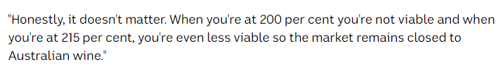 "老实说,这并不重要。当你在200%的时候,你是不可行的,当你在215%的时候,你就更不可行了,所以市场仍然对澳大利亚葡萄酒关闭。"