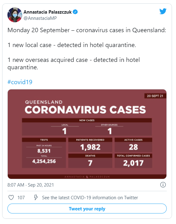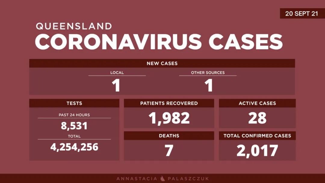 昨天昆士兰州记录了2例新增确诊病例,是在酒店隔离中发现,其中1例本地病例,1例海外病例。据悉,此位Covid阳性病例曾在布里斯班机场停留4小时左右,昆州处于高度警惕状态。