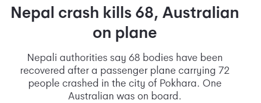 标题: 尼泊尔坠机事件造成68人死亡,飞机上有澳大利亚人!