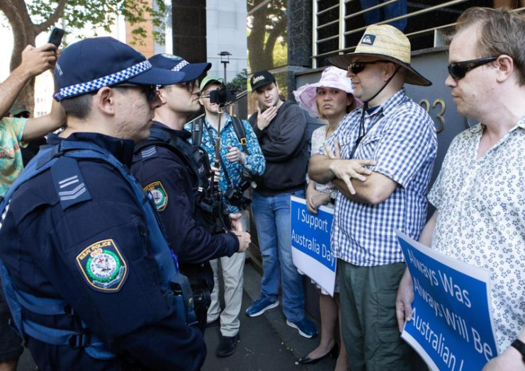 在一个入侵日的集会上,爆发了戏剧性的场面,一名抗议者声称澳大利亚日已经 "死亡和消失"。