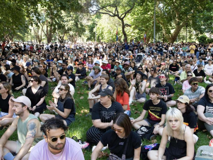 在抗议活动之前,数百人聚集在Barangaroo参加WugulOra早晨的仪式,向第一民族人民致敬,并思考这一天对他们的意义。