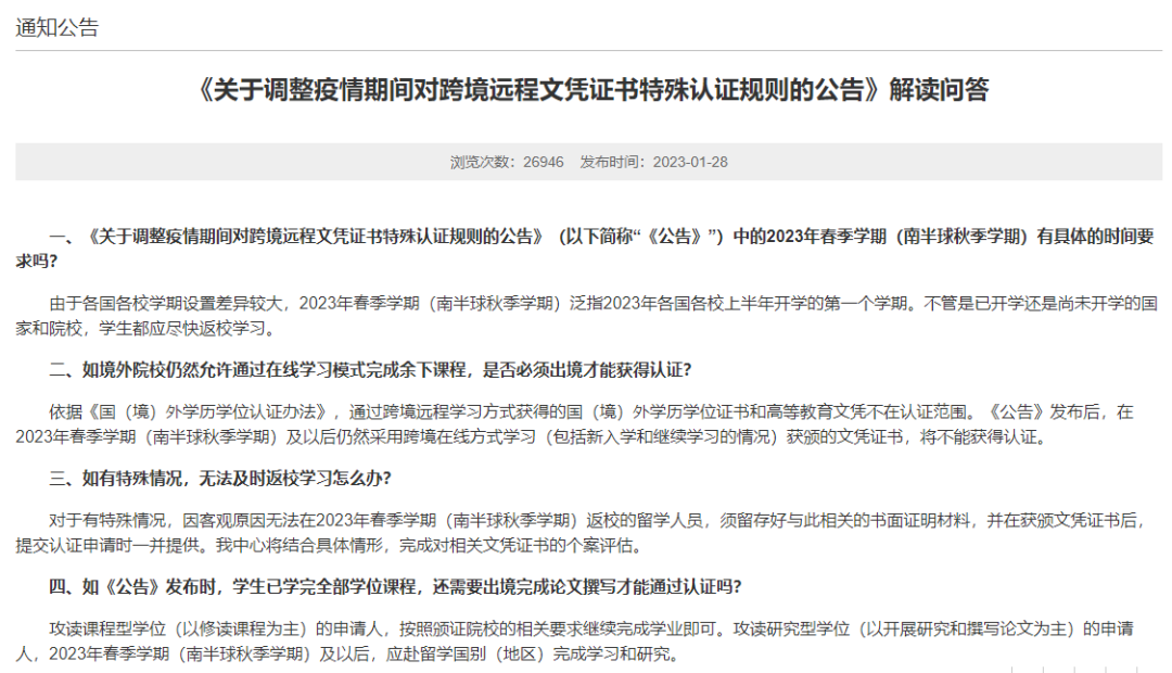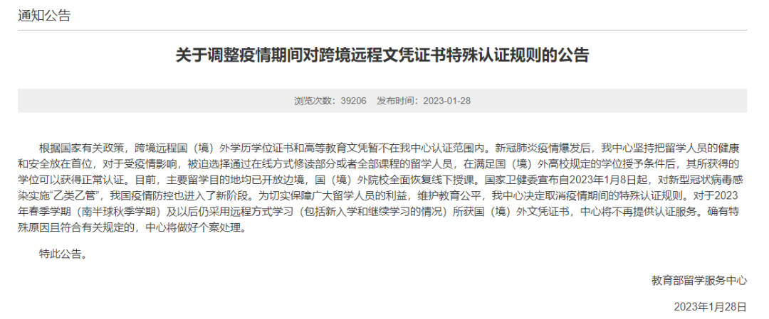 但是,1月28日中国教育部留学服务中心突然更新了这一规定!从2023年的1月开始,中国教育部不再承认网络课程的海外留学模式。