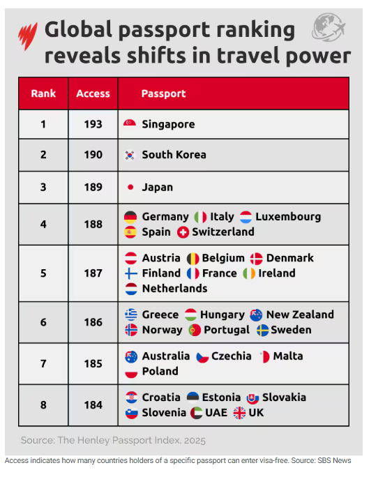 这些变化意味着什么?对多数澳大利亚人而言,护照排名不影响实际出行,但各国排名的动态变化揭示了全球软实力格局的变迁。