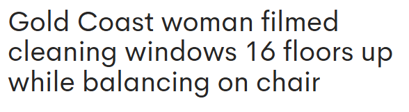 该女子在黄金海岸Peninsula Building的高层公寓擦窗时,危险地站在一把椅子上保持平衡。这段由一位邻居拍摄并发布在网上的视频显示,该女子平静地站在窗外窗台上的椅子上,向外喷洒清洁剂并擦拭窗玻璃。