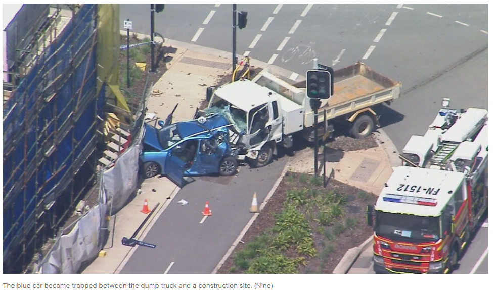 周四临近中午时分,一辆自卸卡车在Banya区Banya Ave与Bruny St交叉口附近追尾一辆轿车,致其横穿道路。
