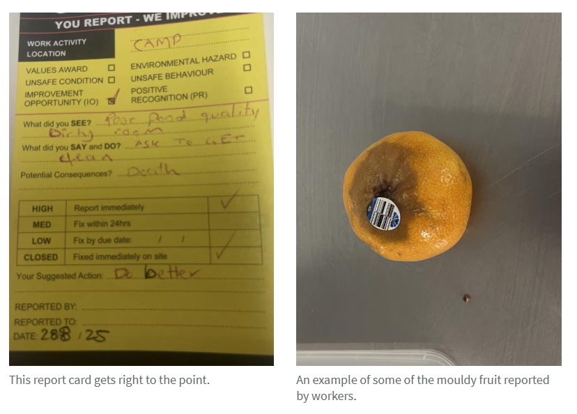 "餐食中出现幼虫显然违反了食品安全标准,并对食品处理、储存、制备以及审计标准和频率方面的疏忽提出严重关切。多名工人长期报告胃肠道疾病,我本人在上次到访时也出现相同症状,"Hill说,"卫生和食品安全标准再次降至不可接受的水平。所附照片显示2026年1月10日营地餐食中存在幼虫。这严重违背了食品安全义务,令人严重质疑营地提供安全、营养膳食的能力。"