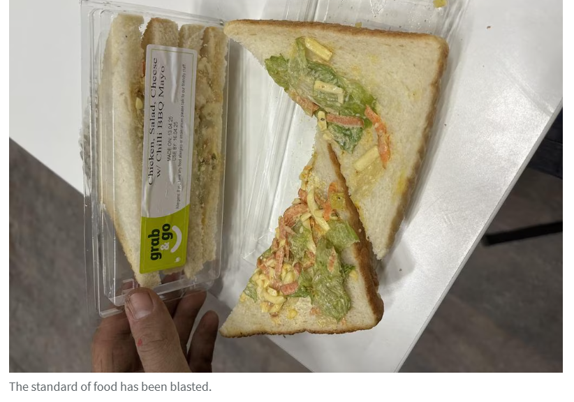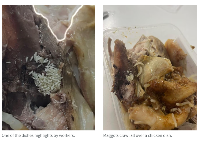 一系列照片显示多起食品问题:食物中发现苍蝇、食品卫生区域脏乱、水果霉变,以及一道鸡肉菜品中滋生蛆虫和幼虫。目前尚不清楚1月10日记录的此次蛆虫污染事件已导致多少工人生病。