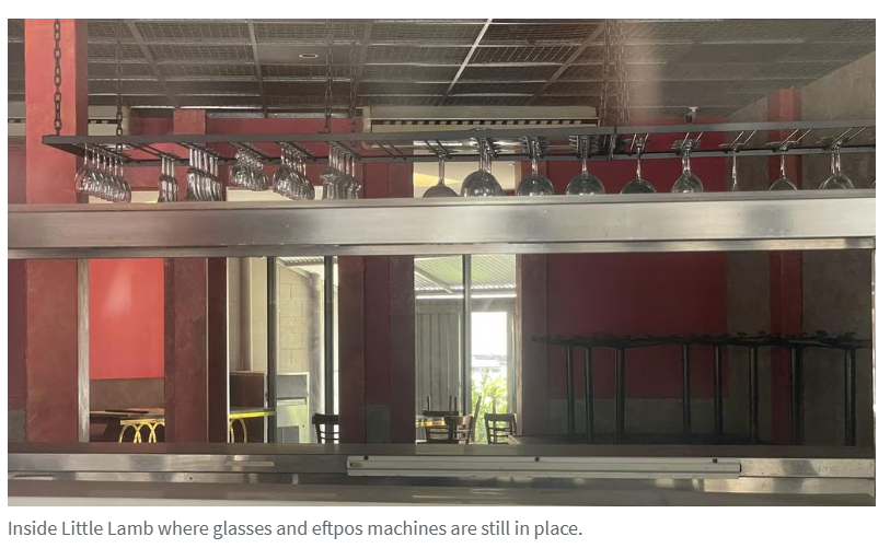 位于Sandgate Rd的Big Belly餐厅在圣诞节前毫无征兆地关闭,室内餐桌上餐具依旧整齐摆放,室外桌椅则积满灰尘,菜单仍悬挂在正门处。沿商业街前行,Little Lamb餐厅虽已停业逾年,其内部葡萄酒杯、冷藏柜及电子刷卡机等物品仍保留在原位。