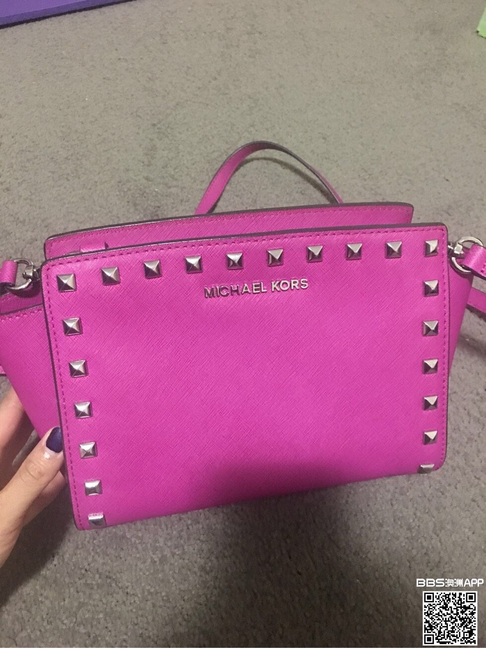 Five Plus小羊皮水桶包 低价转 一口价 80刀 Michael Kors 经典铆钉纹 牛皮中号 单肩包 玫红色 低价出 150刀 电话0413069060