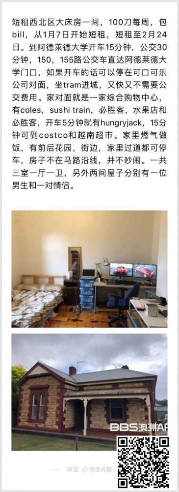 短租西北区大床房一间,100刀每周,包bill,从1月7日开始短租,短租至2月24日。到阿德莱德大学开车15分钟,公交30分钟,150,155路公交车直达阿德莱德大学门口,如果开车的话可以停在可口可乐公司对面,坐tram进城, ...