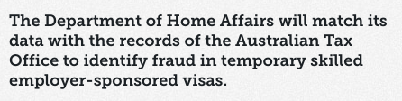 澳洲内政部(Department of Home Affiar, DHA)正将其系统中的移民数据与澳洲税务局(ATO)数据库中的记录做数据匹配,以打击签证诈欺行为,尤其是雇主担保临时技术签证等。 据报道,内政部将于ATO协作 ...