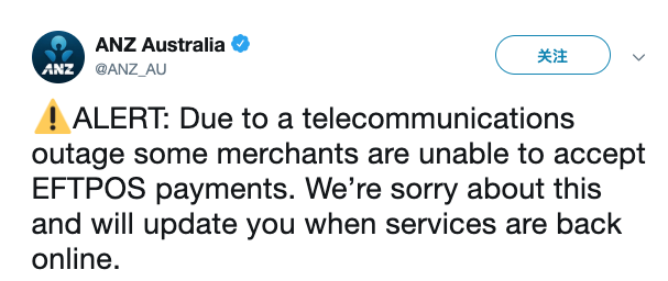 突发! 由于Telstra出故障,导致全澳的POS刷卡机和ATM机都不好用! 所以建议大家暂时还是不要买买买了,等故障解除后再使用!