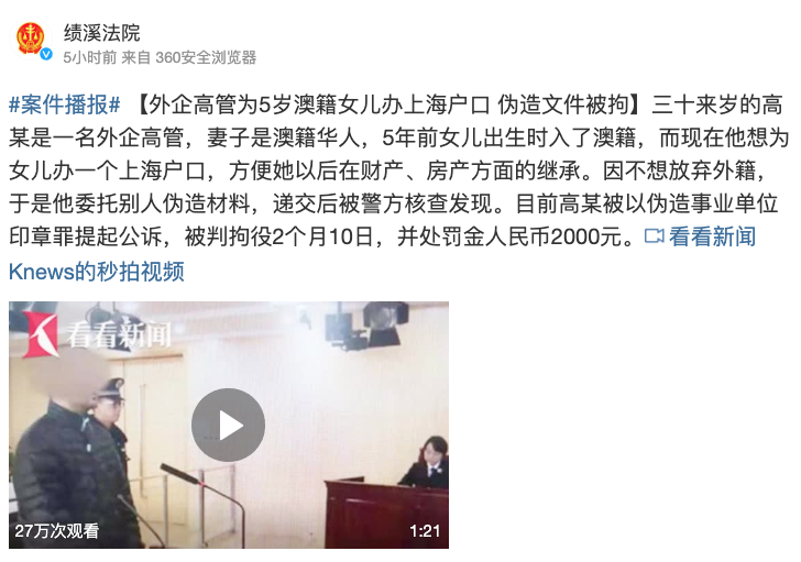 伪造国家机关的证件或印章是违法行为, 这应该是众所周知的常识, 然而却有人为达目的,偏偏要铤而走险,以身试法! 最近上海长宁法院宣判一起案件,外企高管为澳籍女儿伪造文件被判入狱! 如今因为各种各样 ...