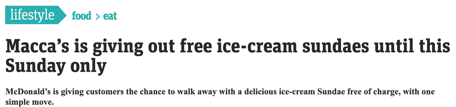 麦当劳冰淇淋圣代免费送! 为了免费的圣代需要先买鸡块。 “但你必须买鸡块!我更喜欢1澳元的苹果派,“一个人说。 另一位补充说:“为获得免费赠品你不得不买鸡块,鸡块会令人反感的。” 一名男子甚 ...
