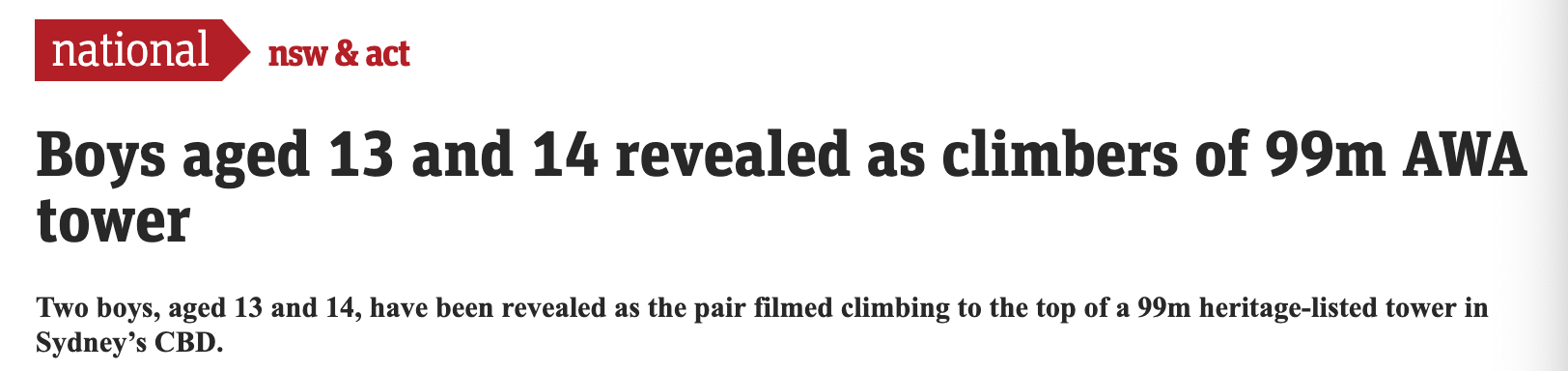 澳洲青少年又作妖,爬上高楼塔尖自拍! 目击者表示,他看见两个人穿着黑衣服,没有安全措施的爬到塔上。 他们中的一个人用一只手抓住“小棍子(尖顶),另一只手拿着手机拍照”。 “他们真是九死一生。 ...