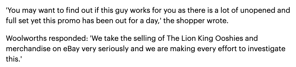Woolworths狮子王玩具被员工网上售卖! 另一名网友则表示不应该抱怨4澳元的售价。 “我宁愿4澳元一个,他们说标牌上的价格是3澳元,但我们却要花20澳元才能得到一个。”她表示。 Woolworths发言人表示,“ ...