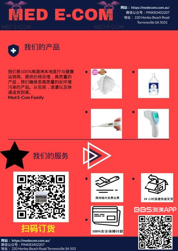 MED E-COM本地医疗健康运销商。 提供口罩, 免洗洗手液,体温计。所有产品澳洲包邮。微信公众号扫码订货。