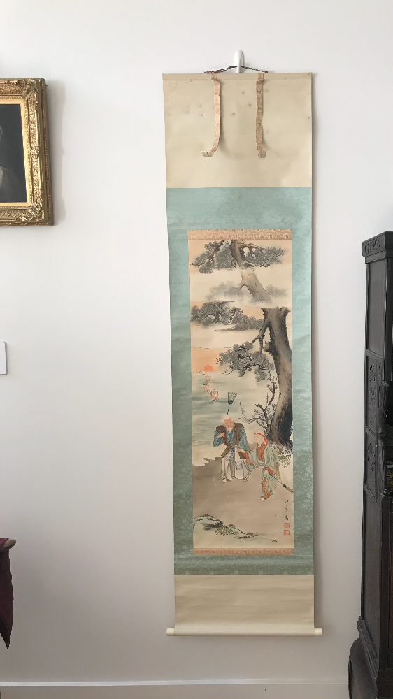 #古董古玩收藏#阿德莱德古董店藏品# 藏品转让。日本古画。装裱等级很高。画轴为象牙,装裱用织锦。有很多的发霉斑点如图。欲转让,价格$1200。感兴趣加微信:hongzhibei. 请注明理由。