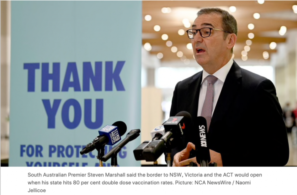 南澳州长史蒂文-马歇尔(Steven Marshall)表示,当南澳80%的人口完全接种疫苗时,将向新州和维州开放边界--很可能在圣诞节之前。 Marshall先生告诉Sky News:"摆脱这种(大流行)的途径是接种疫 ...