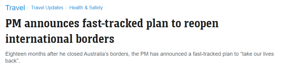 澳大利亚总理莫里森今天宣布了一项快速跟踪计划。国境最早将于11月1日开放! 本月早些时候,总理宣布了各州在同意重新开放国际旅行之前需要满足的新框架。 莫里森说,澳大利亚正在向重新开放计划的C阶 ...