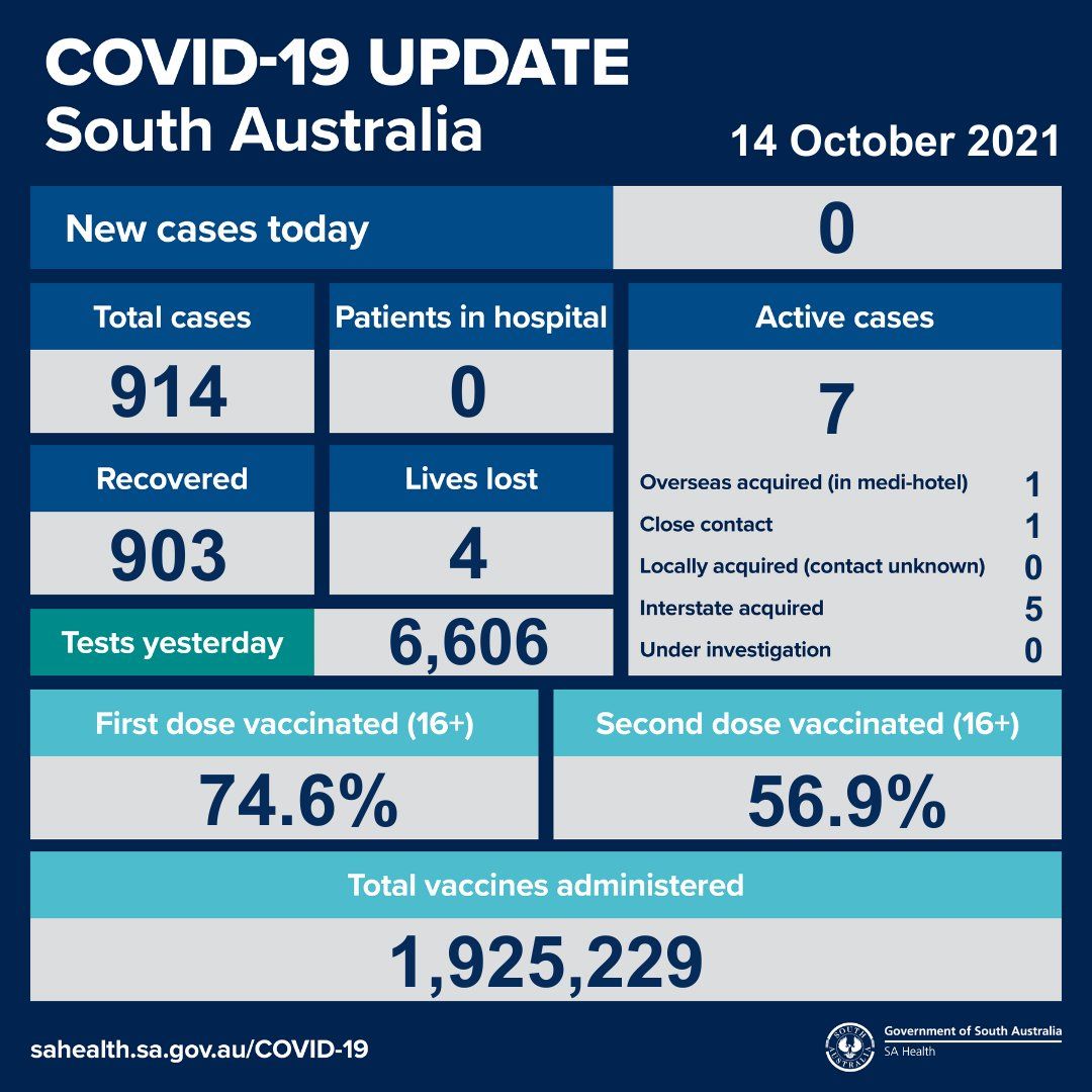 2021年10月14日,星期四,南澳新冠病例情况更新如下: 无新增确诊病例; 活跃病例7例,无患者在医院中康复与治疗。 共康复903例,死亡4例。 昨日共进行检测6606次。 第一针疫苗接种率为74.6%,第二针疫苗 ...