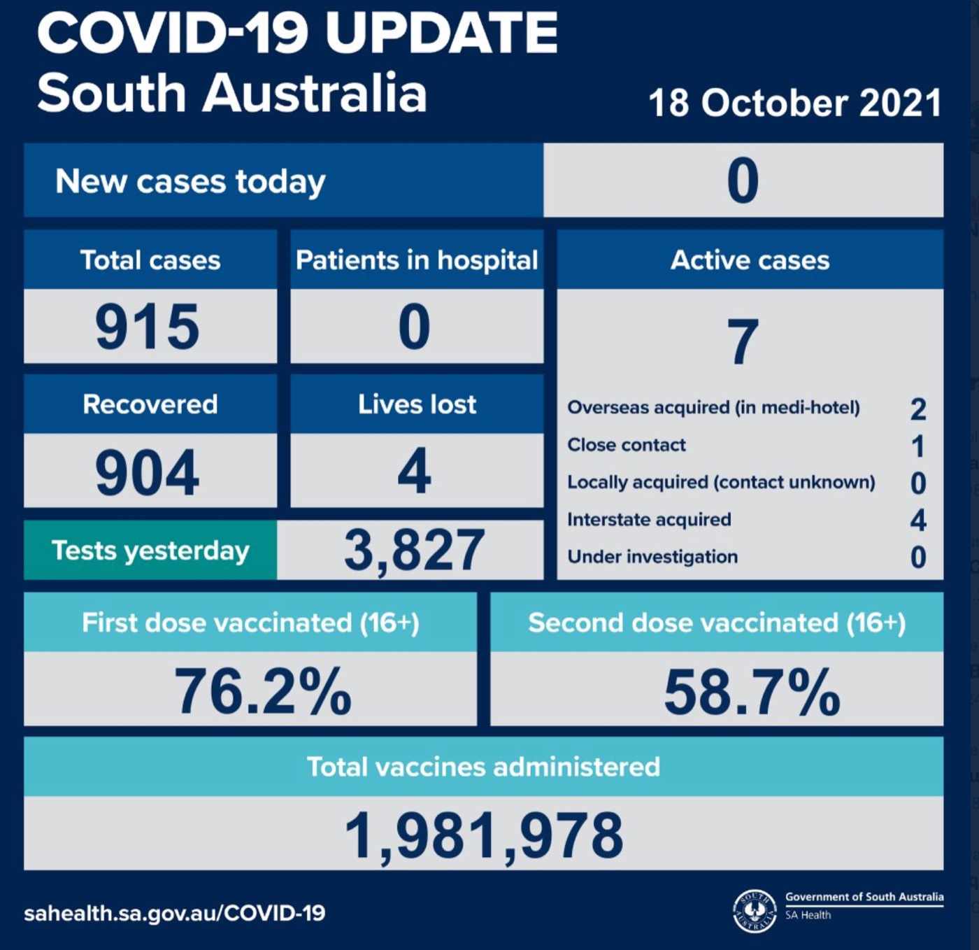 2021年10月18日,星期一,南澳新冠病例情况更新如下: 无新增确诊病例; 活跃病例7例,无患者在医院中康复与治疗。 共康复904例,死亡4例。 昨日共进行检测3827次。 第一针疫苗接种率为76.2%,第二针疫 ...