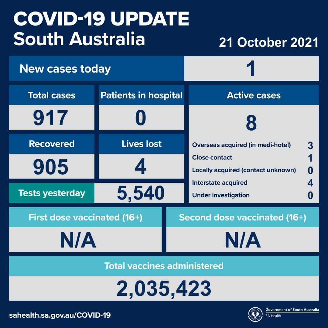 2021年10月21日,星期四,南澳新冠病例情况更新如下: 无本地新增确诊病例;1例海外获得的病例,是一位30多岁的男性,在海外感染,自从进入南澳,一直在酒店进行隔离。不是活跃病例。 活跃病例8例,无患者在医院 ...