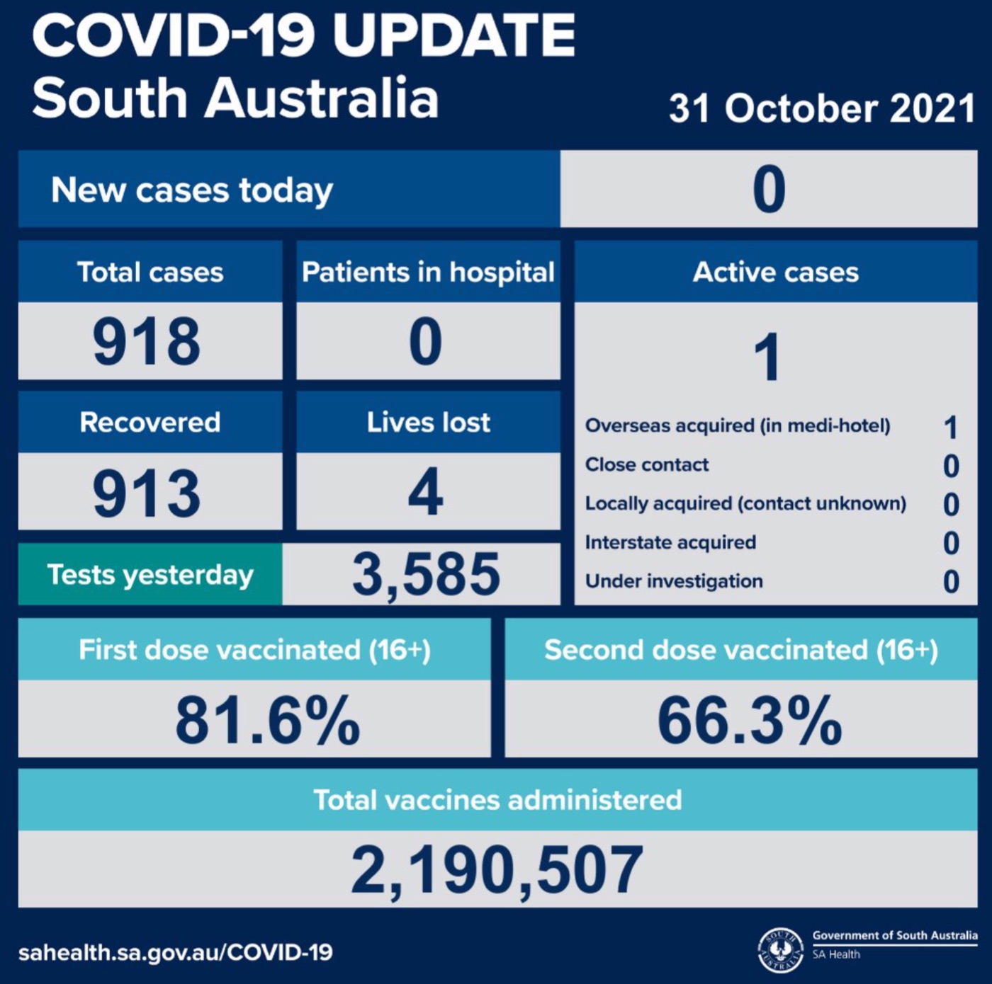 2021年10月31日,星期天,南澳新冠病例情况更新如下: 无新增确诊病例; 活跃病例1例,无患者在医院中康复与治疗。 共康复913例,死亡4例。 昨日共进行检测3585次。 第一针疫苗接种率为81.6%,第二针疫苗接种 ...