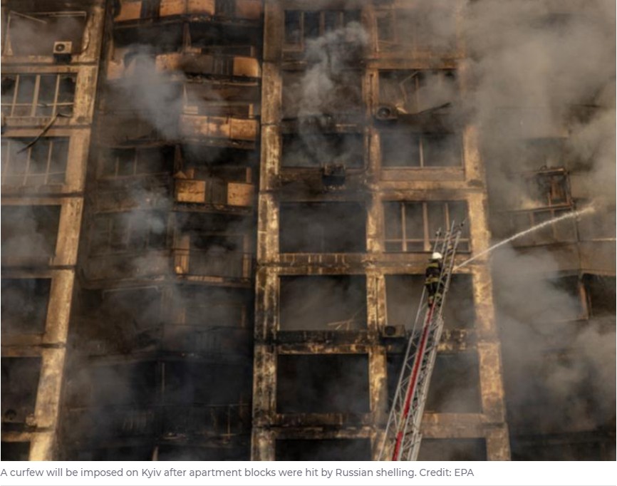 乌克兰首都基辅市长Vitaliy Klitschko宣布,该市将从周二晚上8点到周四早上7点实行宵禁,因为驻扎在城外的俄罗斯军队袭击了几个公寓区。 周二黎明前,首都发生了两场强烈的爆炸,紧急服务部门说,一栋公寓 ...