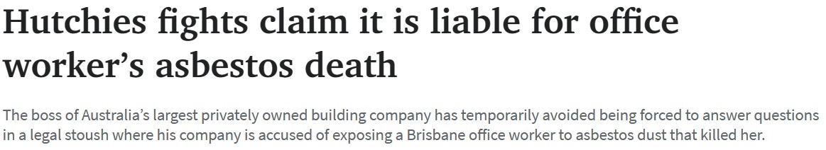 澳大利亚最大的私营建筑公司老板暂时避免了在一场法律纠纷中被迫回答问题。他的公司被指控对布里斯班一栋摩天大楼进行的翻新工程使一名上班族暴露在石棉尘埃中,这导致她死亡。 对Hutchinson先生的讯问 ...