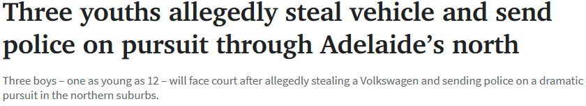 三名男孩,其中一名年仅12岁,在阿德莱德北部郊区盗窃车辆并危险驾驶。 直升机被指派协助搜索,发现了这三名男孩的行踪。警方开始徒步追捕这三名男孩,并很快将其逮捕。 据称这三名男孩持有被盗汽车的钥匙 ...