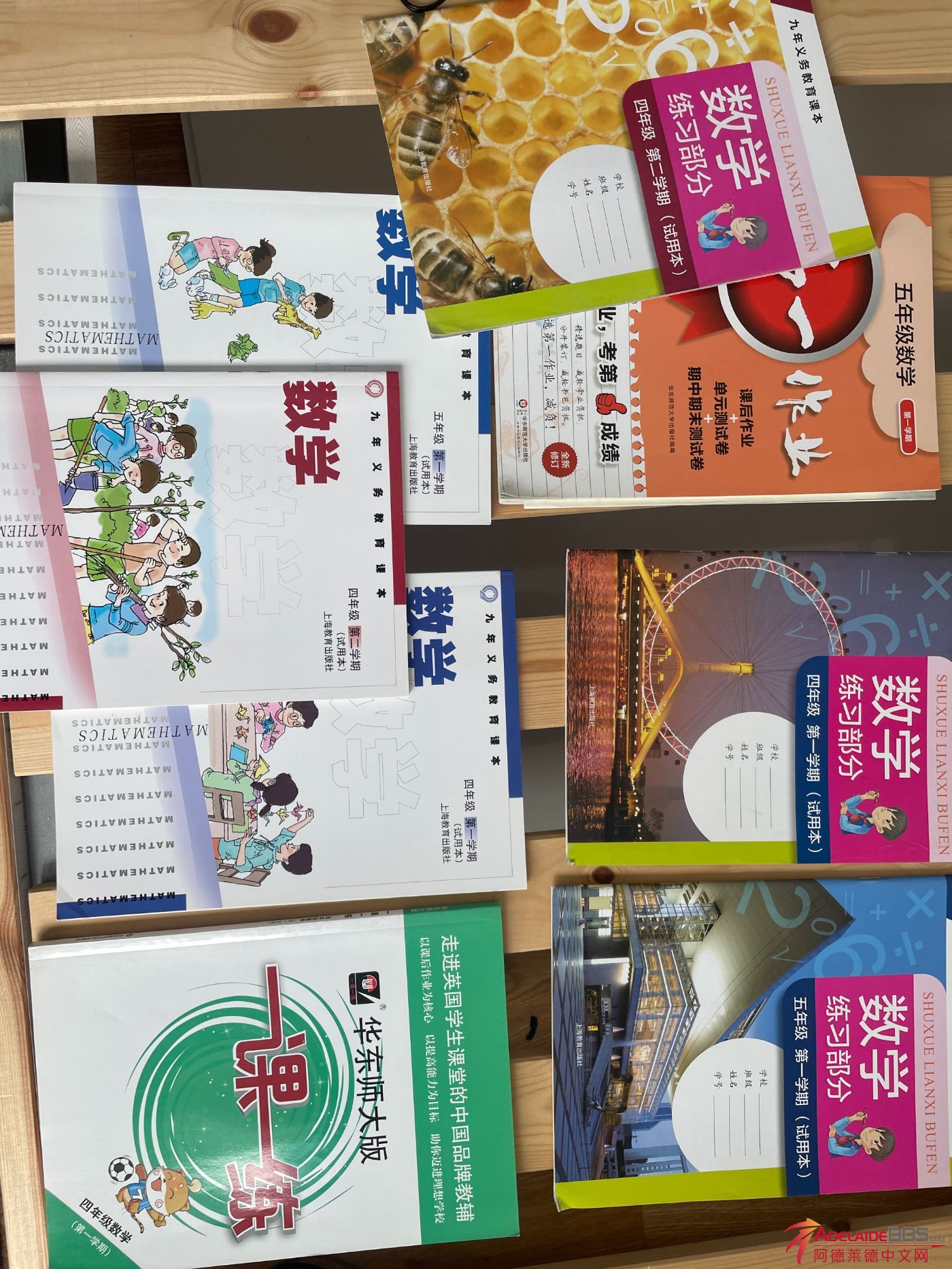 从国内带来的小学四五年级数学课本,上海教育出版社的,四年级上下学期两个课本+三个题集。 五年级上下学期课本+一个题集。 因为娃来的时候英语不好担心听不懂老师讲课,所以买了整个小学的中文数学,在家里先给 ...