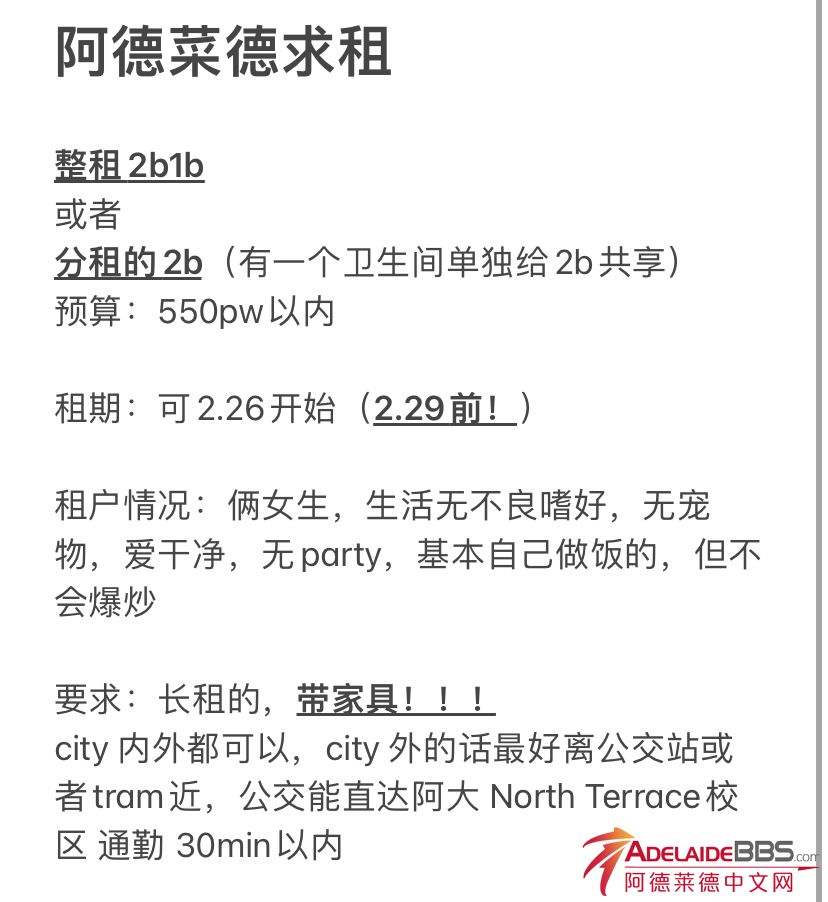 求租 整租2b1b 或者 分租的2b(有一个卫生间单独给2b共享) 预算:550pw以内 租期:可2.26开始(2.29前!) 租户情况:俩女生,生活无不良嗜好,无宠物,爱干净,无party,基本自己做饭的,但不会爆炒 要求:长 ...