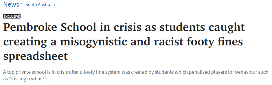 阿德莱德精英私校陷入丑闻危机,学生制作侮辱性罚款单! 据《Advertiser》周三报道,南澳顶级私校Pembroke School陷入"危机"。该校一些参加橄榄球运动的学生创建了一个带有厌女性和种族主义色彩的"校 ...