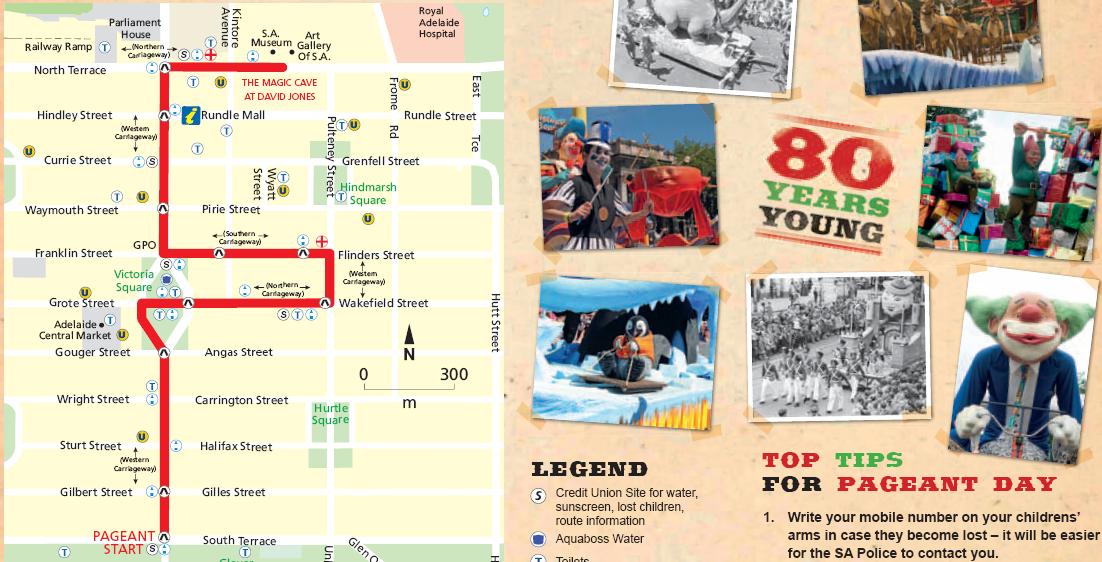 封路时间 Road closures Road closures On Saturday 10 November 2012, the Credit Union Christmas Pageant will once again entertain the people of South Australia and visitors from interstate and overseas. The following roads will be closed for the event. Flinders Street northern carriageway between King William Street and Gawler Place ( except parking lane for Medina Hotel guests only ) 9.30 am Friday 9th - 10.00 pm Saturday 10th North Terrace - 3 lanes of Southern carriageway between Charles Street and Gawler Place ( includes parking lane, leaving one lane open for west bound traffic) 10.00 am - 3.00 pm Friday 9th North Terrace - 2 lanes of Southern carriageway between Charles Street and Gawler Place ( includes parking lane, leaving two lanes open for west bound traffic) 3.00 pm Friday 9th – 6.00 am Saturday 10th Peacock Road between Greenhill Road and South Terrace 5.00 am – 1.00 pm South Terrace between Pulteney Street and Morphett Street 5.00 am – 1.00 pm South Terrace between King William Street and Morphett Street 5.00 am – 1.00 pm King William street between South Terrace and Gouger Street 5.00 am – 1.00 pm Grote Street between Pitt Street and Victoria Square 7.00 am - 1.00 pm Victoria Square in its entirety 7.00 am – 1.00 pm Wakefield Street Between Victoria Square and Pulteney Street 7.00 am – 1.00 pm Pulteney Street between Bath Lane and Pirie Street 7.00 am – 1.00 pm Flinders Street between King William Street and Pulteney Street 7.00 am – 1.00 pm Currie Street between Peel Street and King William Street 7.00 am - 1.00 pm King William Street between Victoria Square and North Terrace 7.00 am – 1.00 pm Kintore Avenue between North Terrace and Morgan Thomas Lane 5.00 am – 1.00 pm North Terrace between Station Road and Frome Street 7.00 am – 1.00 pm North Terrace - 2 lanes of Southern carriageway between Charles Street and Gawler Place (includes parking lane, leaving two lanes open for west bound traffic) 1.00 pm - 5.30 pm |