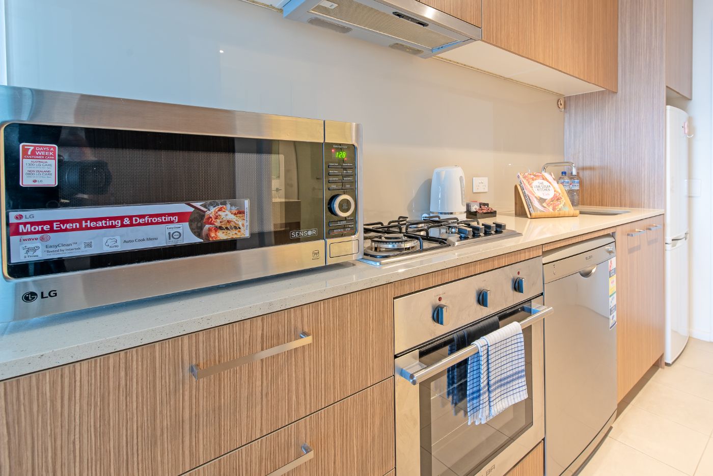 - 现代化开放式厨房设计,带燃气灶具、管道抽油烟机、烤箱和洗碗机