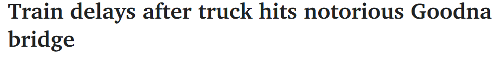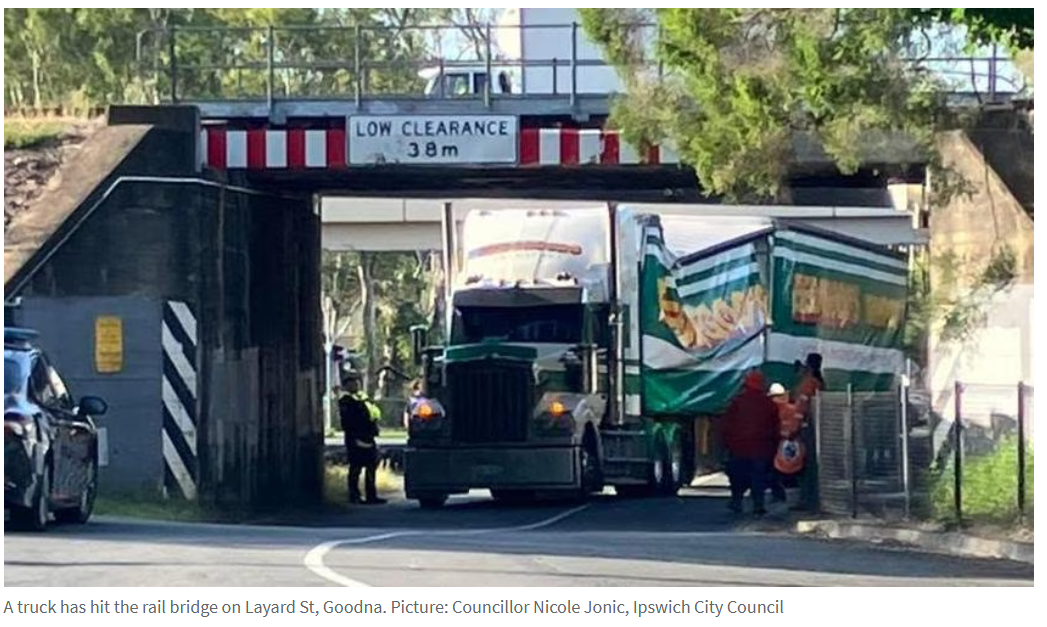 今晨约7时,一辆卡车在Goodna站附近的Layard St撞上该问题桥梁,造成Ipswich线双向列车延误约15分钟。