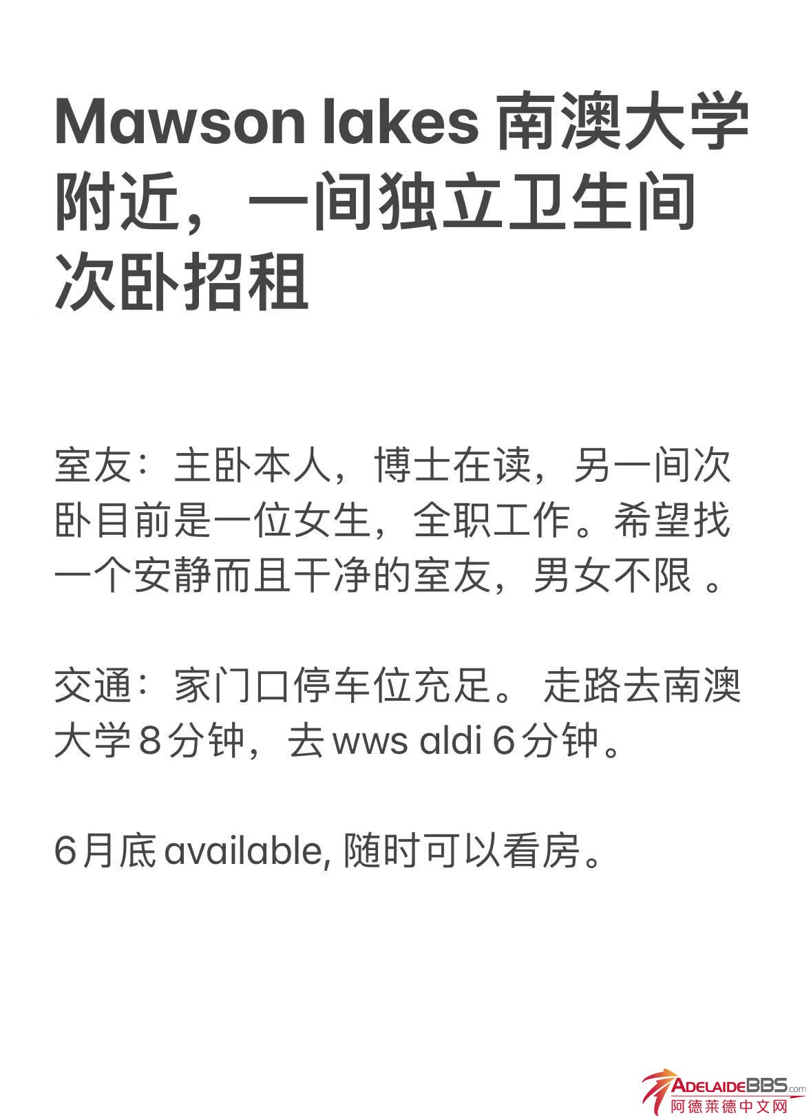 Mawson lakes 南澳大学一间独立卫生间的次卧招租。 wechat: xuzhiqing0708 Tel: 0414722792