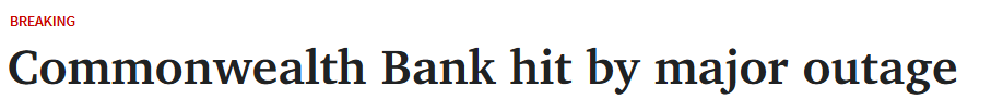 据10月2日报道,Commonwealth Bank遭遇重大系统故障,手机应用程序、自动取款机均受影响,甚至导致部分分行被迫停止营业。 在线银行服务(包括手机应用程序)已全部瘫痪。据了解,部分银行网点因此提前结束当日营业 ...