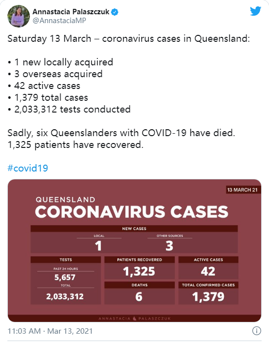 昆士兰卫生部表示,检测结果显示,这名工作人员的病毒水平较低,这意味着这名工作人员可能在3月11日的一天左右才在社区具有传染性。