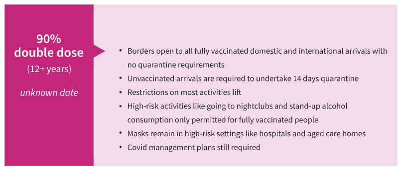 当全州80%的16岁及以上的人完全接种疫苗后,目前的密度要求将保持不变。高风险活动,如去夜总会和站起来喝酒,只有当12岁及以上的人中有90%的人完全接种了疫苗时,才可以进行。