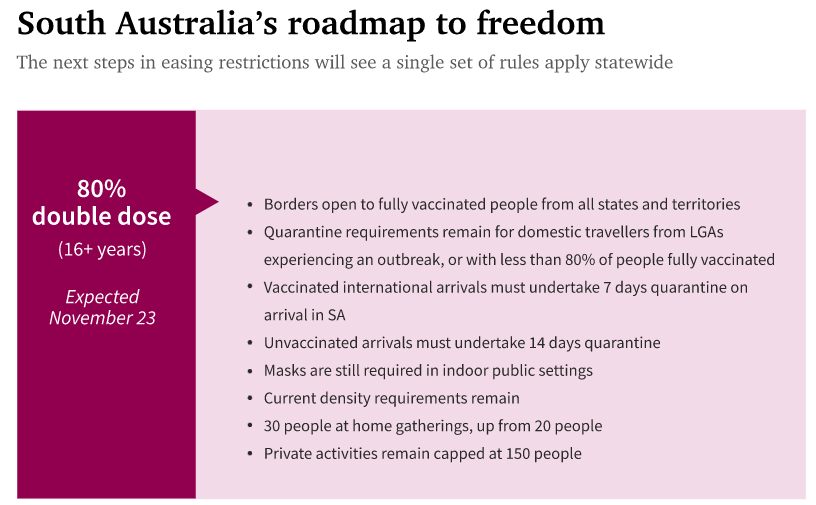 当90%的12岁及以上的南澳大利亚人完全接种疫苗时,大部分限制就会放松。这可能是在12月中旬至下旬。