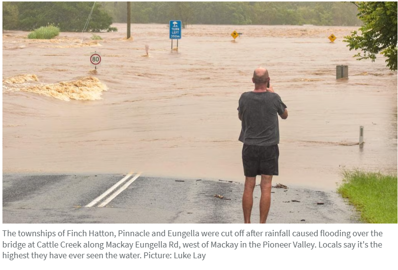 部分地点已录得极端降雨数据,截至周日上午11点的六小时内,Mt William降雨291毫米,Upper Finch Hatton Creek降雨264毫米。由于集水区已饱和且河流水位高涨,气象局警告居民需警惕河水快速上涨及洪灾恶化。