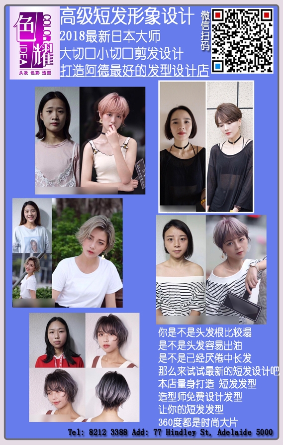 阿德莱德最好的剪发店 ---- 色耀 全新推出 高级短发形象设计 2018最新日本大师 大切口小切口剪发设计