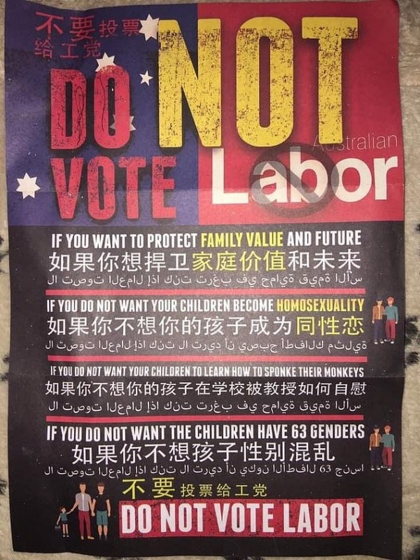 联邦大选即将在两个月后举行, 各种拉票手段和宣传也是层出不穷。 但是,最近在澳大利亚悉尼华人聚集区的Hurstville和Campsie的居民收到奇怪的传单, 上面用英文、中文和阿拉伯文写着耸人听闻的标语! 新州 ...