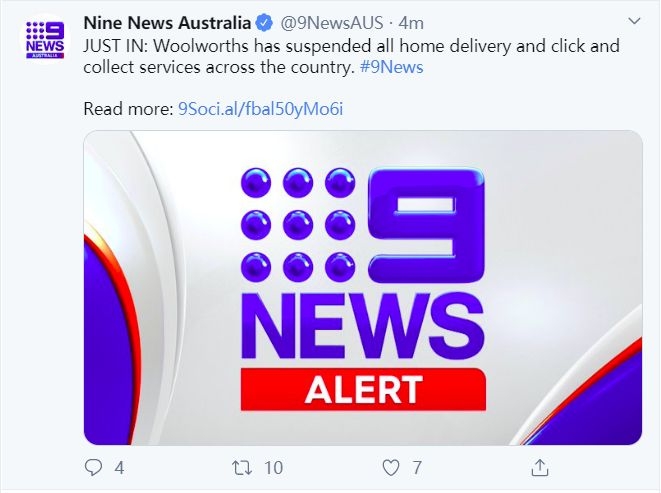 据9 News报道,Woolworths已暂停了全国范围内的所有送货上门服务以及门店自取服务。