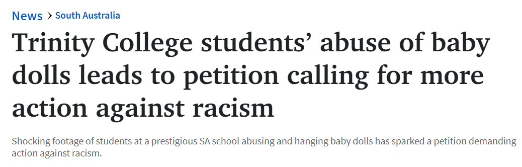 据报道,南澳媒体今日在披露7名Trinity College学生虐待娃娃被停学后,此事又引发数千人请愿呼吁采取更多行动反对种族主义。 请愿书将呼吁学校董事会要求学生和教师“接受为期一年的文化敏感培训”。 Trinit ...