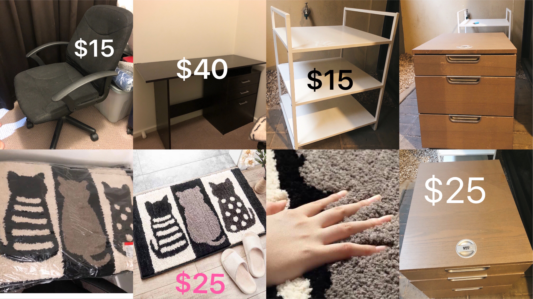 出售一些闲置家具 家在唐人街,家具都需要自取哦。 如有兴趣可以信息0481289444 (平时都在上班,请短信联系,谢谢) 如果可以买一件以上,价格可以商量 白色架子:70 高 49.5 宽 50 长 黑色桌子:48cm 宽 75cm 高 ...